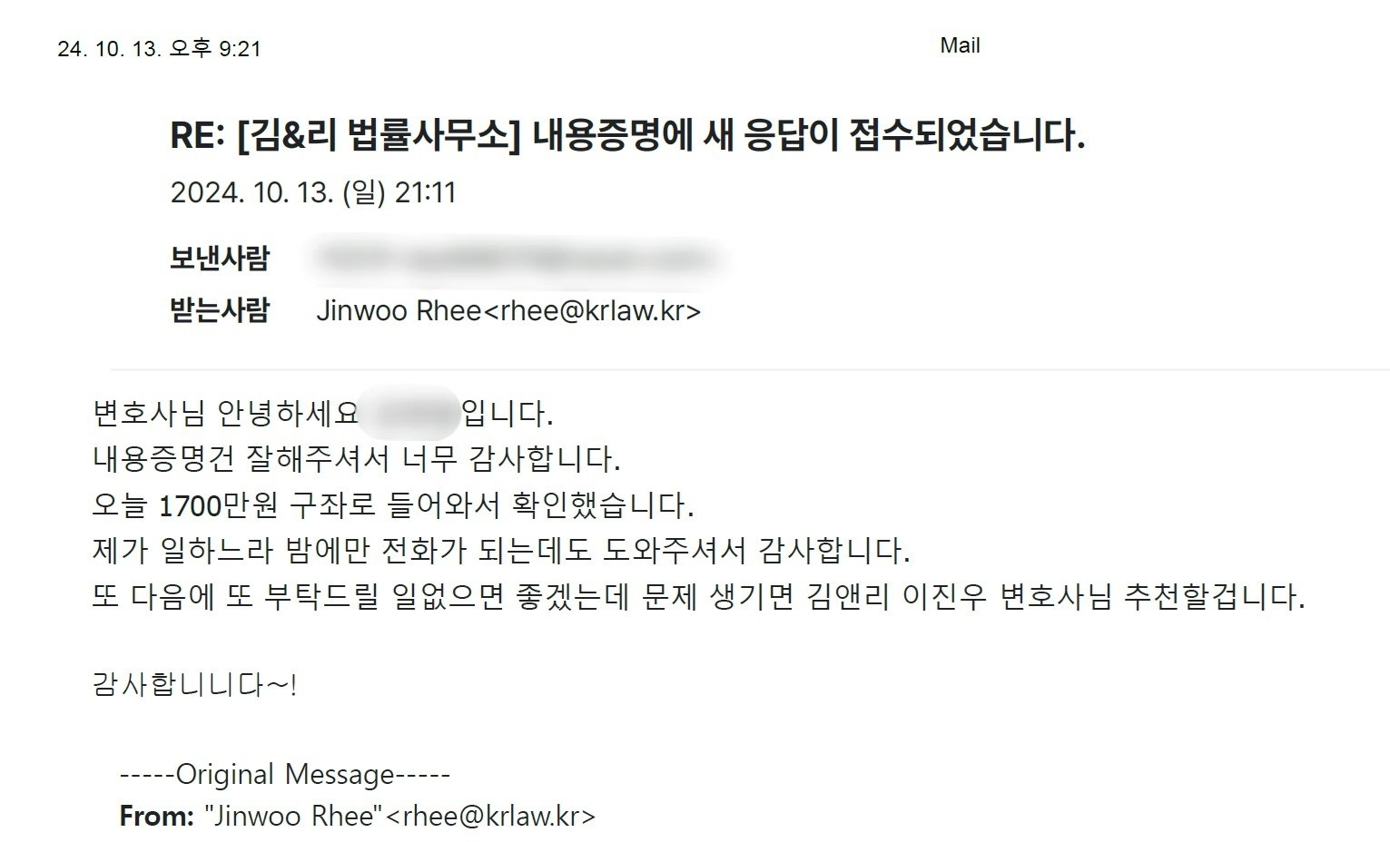 김앤리 법률사무소는 24시간 법률서비스를 제공하기에 고객님과 항상 소통하며 작업을 진행했습니다.
